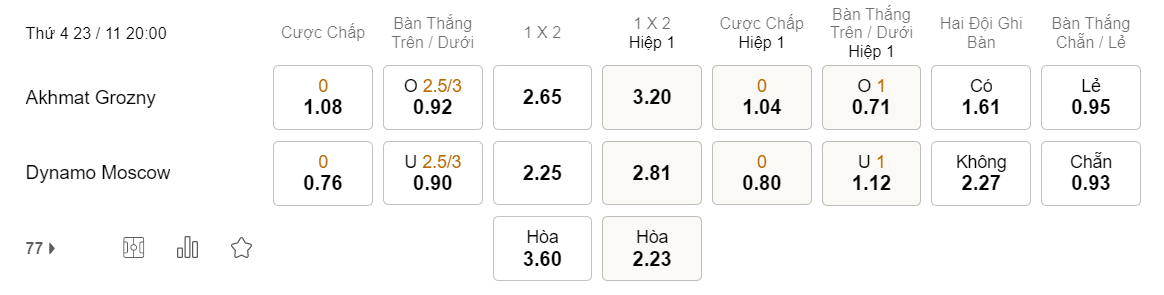Tỉ lệ kèo Akhmat Grozny vs Dinamo Moscow