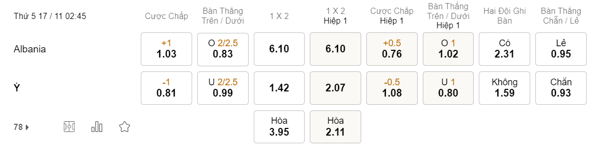 Tỉ lệ kèo Albania vs Ý