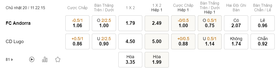 Soi kèo hiệp 1 Andorra vs Lugo: 1.00*0/0.5*0.88