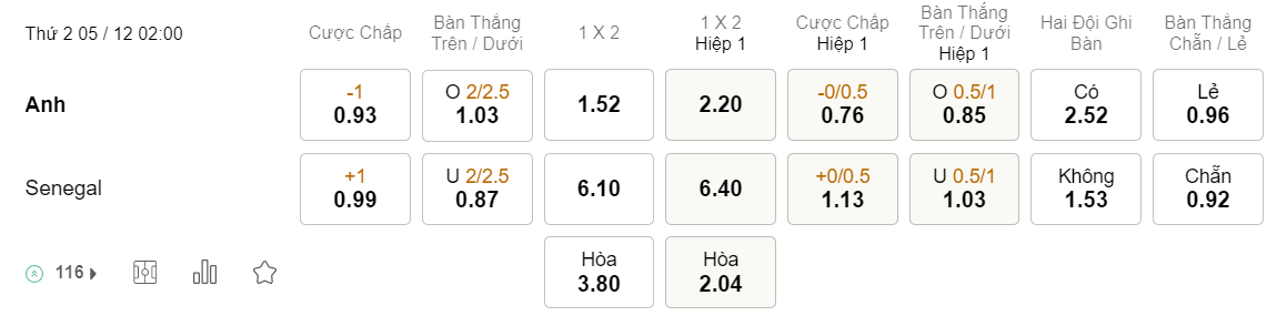 Soi kèo hiệp 1 Anh vs Senegal: 0.76*0/0.5*1.13