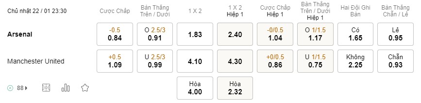 Soi kèo hiệp 1 Arsenal vs MU: 1.04*0/0.5*0.86