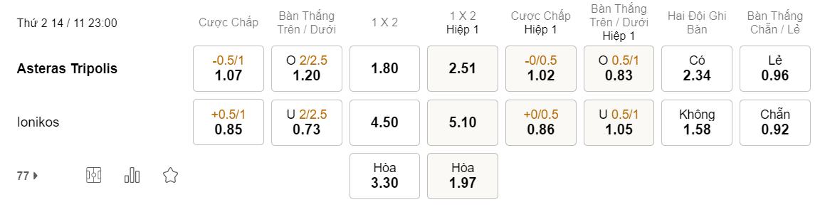 Soi kèo hiệp 1 Asteras Tripolis vs Ionikos: 1.02*0/0.5*0.86