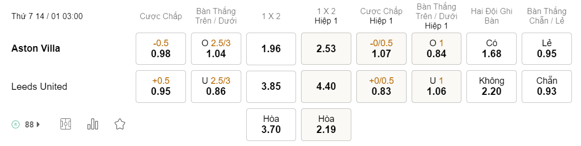 Tỉ lệ kèo Aston Villa vs Leeds