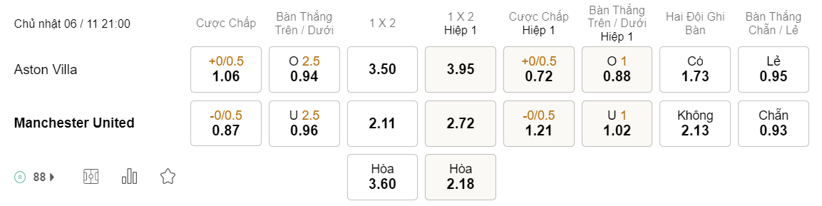 Soi kèo hiệp 1 Aston Villa vs MU: 0.72*0/0.5*1.21