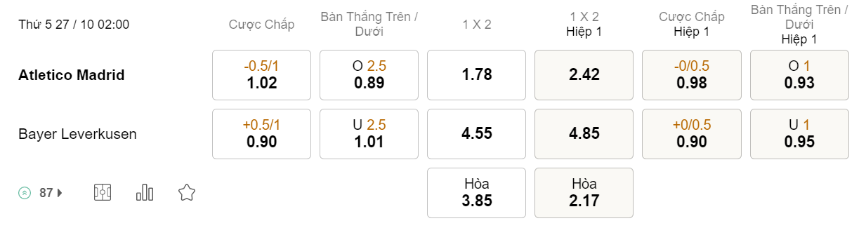 Soi kèo châu Á Atletico Madrid vs Leverkusen: 1.02*0.5/1*0.90