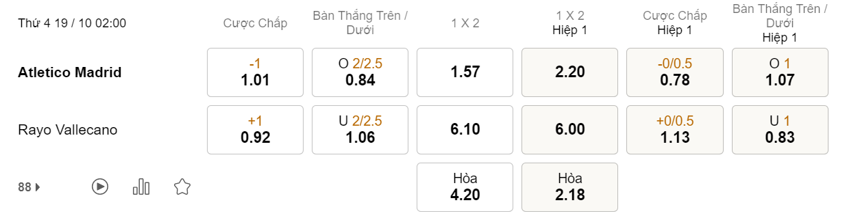Soi kèo châu Á Atletico Madrid vs Rayo Vallecano: 1.01*1*0.92