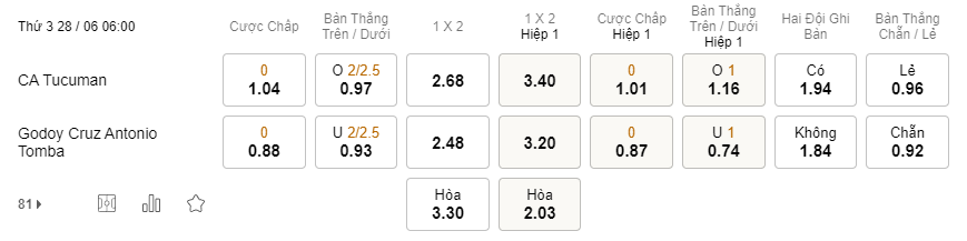 Soi kèo châu Á Atletico Tucuman vs Godoy Cruz: 1.04*0*0.88
