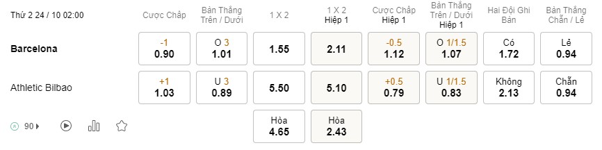 Soi kèo hiệp 1 Barcelona vs Bilbao: 1.12*0.5*0.79