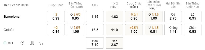 Soi kèo hiệp 1 Barcelona vs Getafe: 0.90*0.5/1*1.00