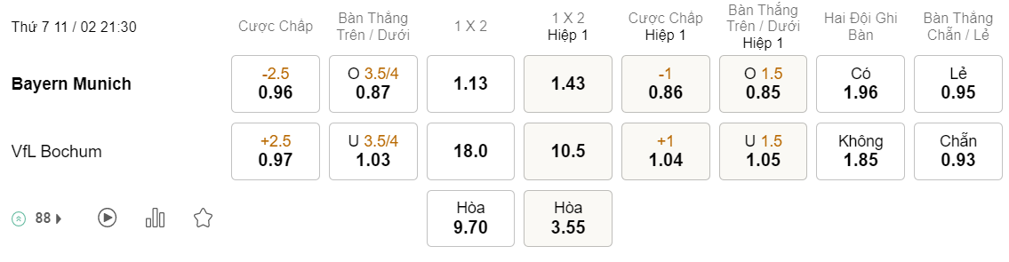 Soi kèo hiệp 1 Bayern vs Bochum: 0.86*1*1.04