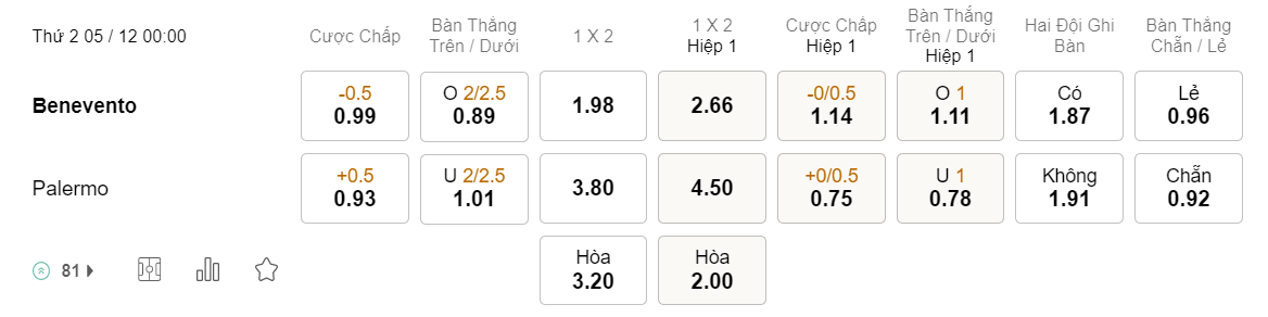 Soi kèo hiệp 1 Benevento vs Palermo: 1.14*0/0.5*0.75
