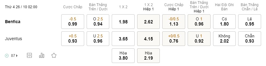 Soi kèo hiệp 1 Benfica vs Juventus: 1.13*0/0.5*0.76