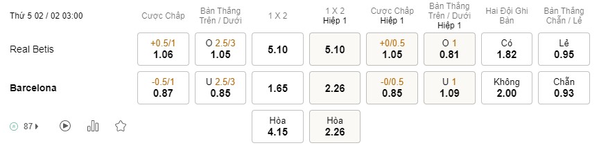 Soi kèo hiệp 1 Betis vs Barcelona: 1.05*0/0.5*0.85