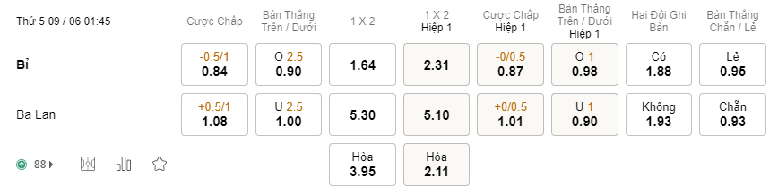 Tỉ lệ kèo Bỉ vs Ba Lan