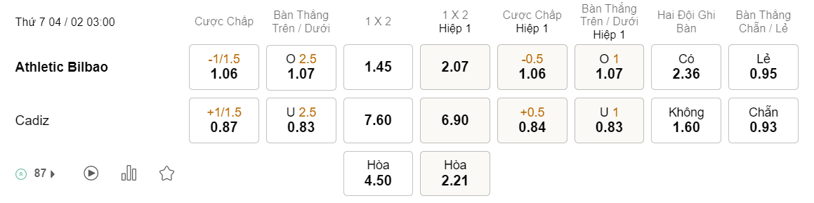 Tỉ lệ kèo Bilbao vs Cadiz