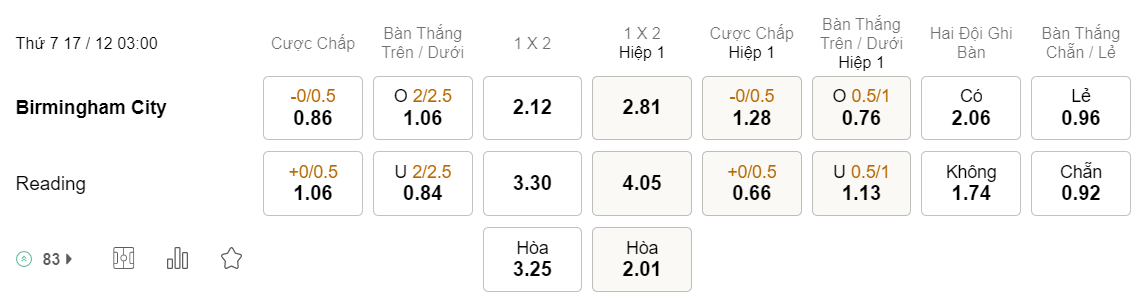 Tỉ lệ kèo Birmingham vs Reading
