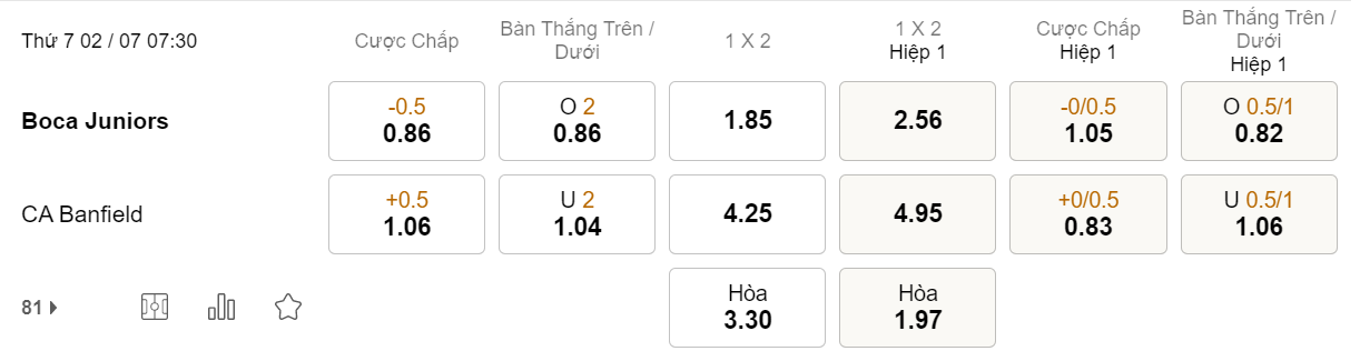 Tỉ lệ kèo Boca Juniors vs Banfield
