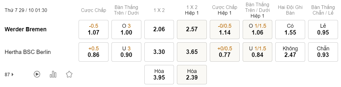 Soi kèo tài xỉu Bremen vs Hertha Berlin: 1.00*3*0.90