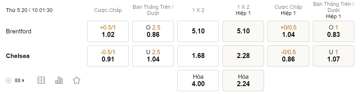 Soi kèo châu Á Brentford vs Chelsea: 1.02*0.5/1*0.91