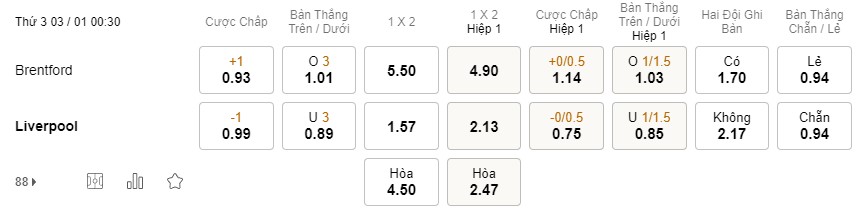 Tỉ lệ kèo Brentford vs Liverpool