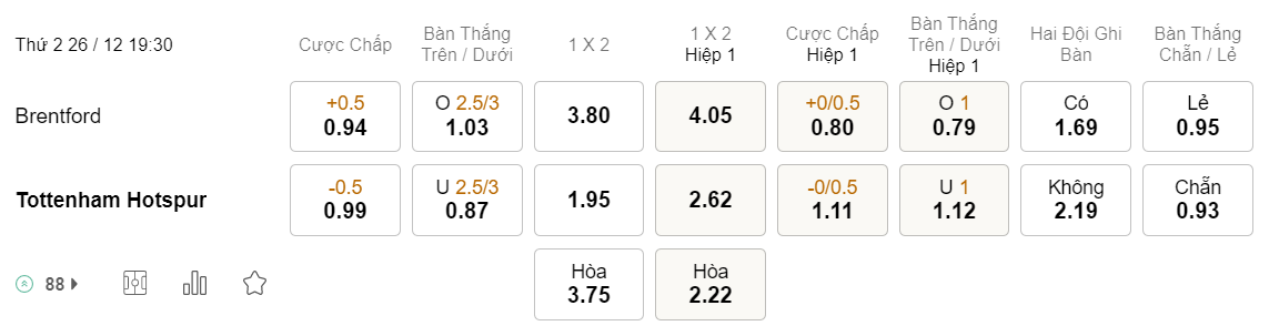 Soi kèo châu Á Brentford vs Tottenham: 0.94*0.5*0.99