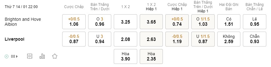 Soi kèo tài xỉu Brighton vs Liverpool: 0.96*3*0.94