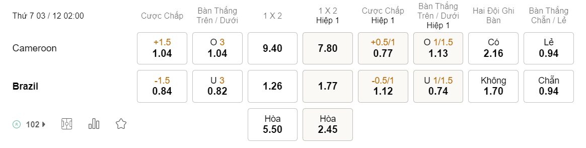 Soi kèo hiệp 1 Cameroon vs Brazil: 0.77*0.5/1*1.12