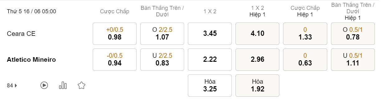 Soi kèo hiệp 1 Ceara vs Atletico Mineiro: 1.33*0*0.63