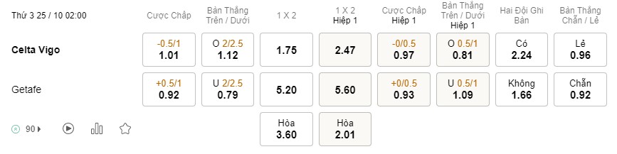 Tỉ lệ kèo Celta Vigo vs Getafe