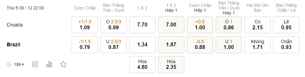 Soi kèo châu Á Croatia vs Brazil: 1.09*1/1.5*0.79