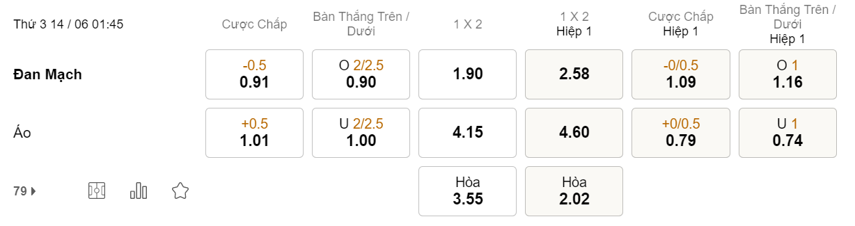 Soi kèo châu Á Đan Mạch vs Áo: 0.91*0.5*1.01