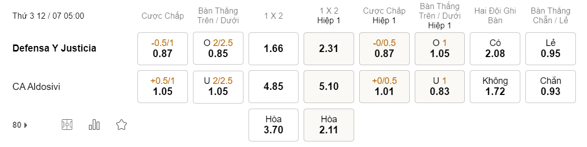 Tỉ lệ kèo Defensa Justicia vs Aldosivi
