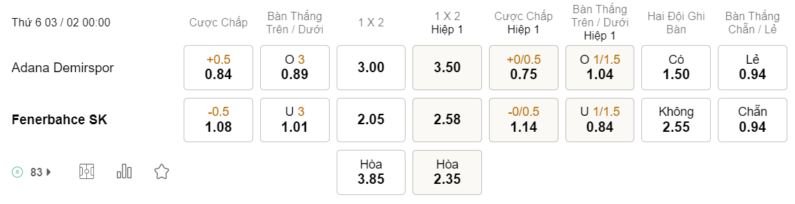 Soi kèo hiệp 1 Demirspor vs Fenerbahce: 0.75*0/0.5*1.14