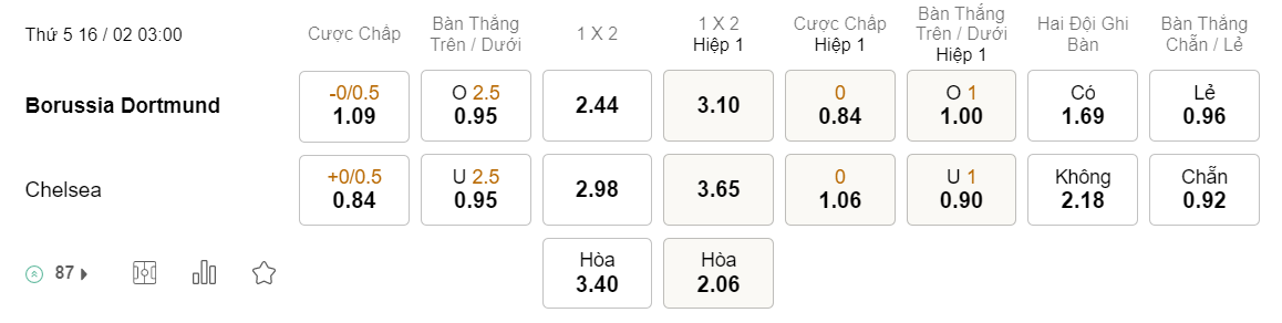 Soi kèo hiệp 1 Dortmund vs Chelsea: 0.84*0*1.06
