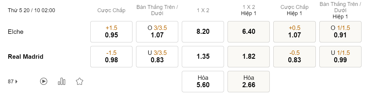 Soi kèo hiệp 1 Elche vs Real Madrid: 1.07*0.5*0.83