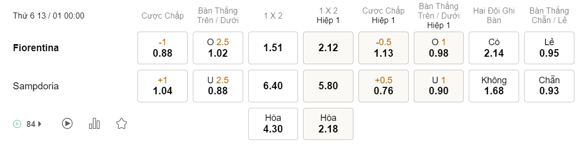 Tỉ lệ kèo Fiorentina vs Sampdoria
