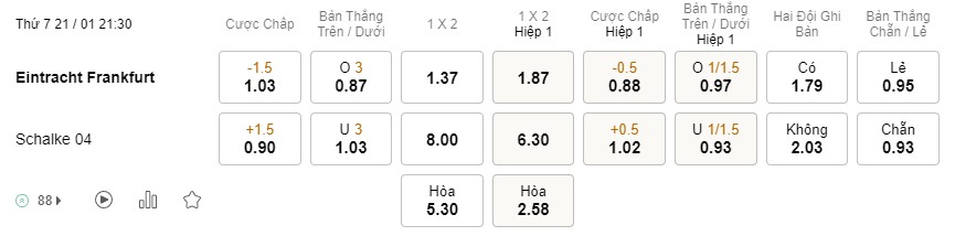 Tỉ lệ kèo Frankfurt vs Schalke