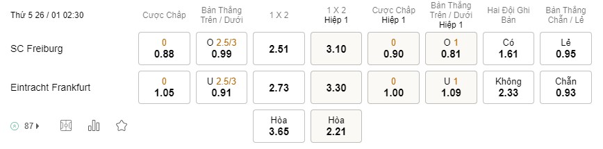 Soi kèo châu Á Freiburg vs Frankfurt: 0.88*0*1.05