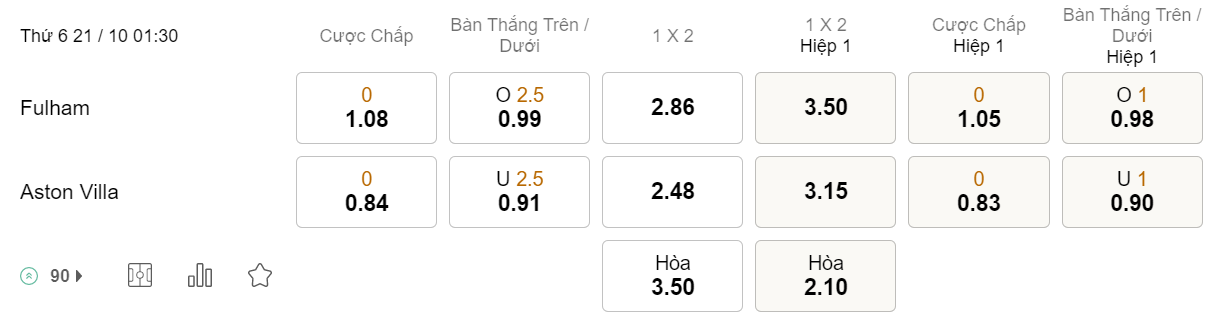 Soi kèo hiệp 1 Fulham vs Aston Villa: 1.05*0*0.83