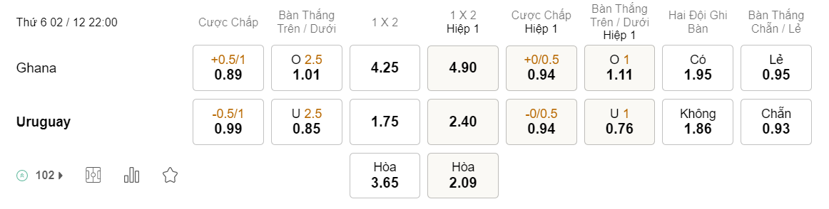 Soi kèo tài xỉu Ghana vs Uruguay: 1.01*2.5*0.85