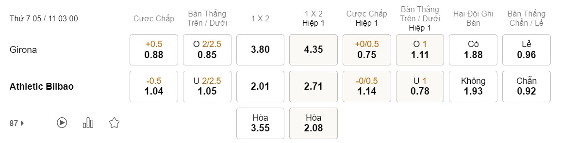 Soi kèo hiệp 1 Girona vs Bilbao: 0.75*0/0.5*1.14