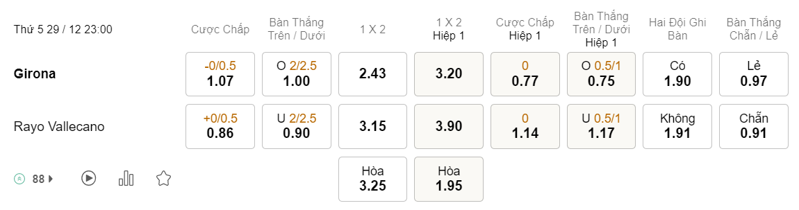 Soi kèo hiệp 1 Girona vs Vallecano: 0.77*0*1.14