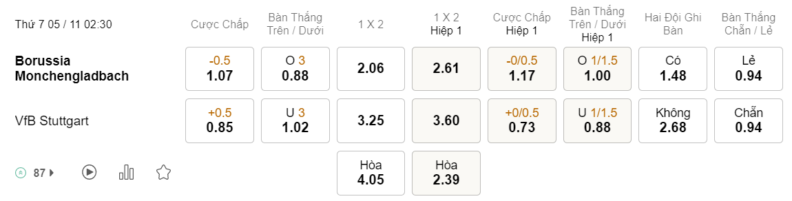 Tỉ lệ kèo Gladbach vs Stuttgart