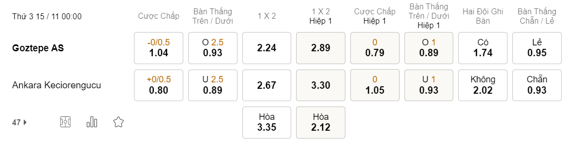 Soi kèo tài xỉu Goztepe vs Ankara: 0.93*2.5*0.89