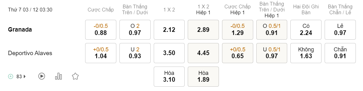 Theo thống kê, 4/5 cuộc trạm chán gần nhất giữa Granada và Alaves đã chứng kiến bàn thắng được ghi trong 45 phút đầu tiên. Do đó, khả năng cao đội khách được đánh giá cao hơn sẽ sớm có được bàn thắng sau hiệp thi đấu đầu tiên.