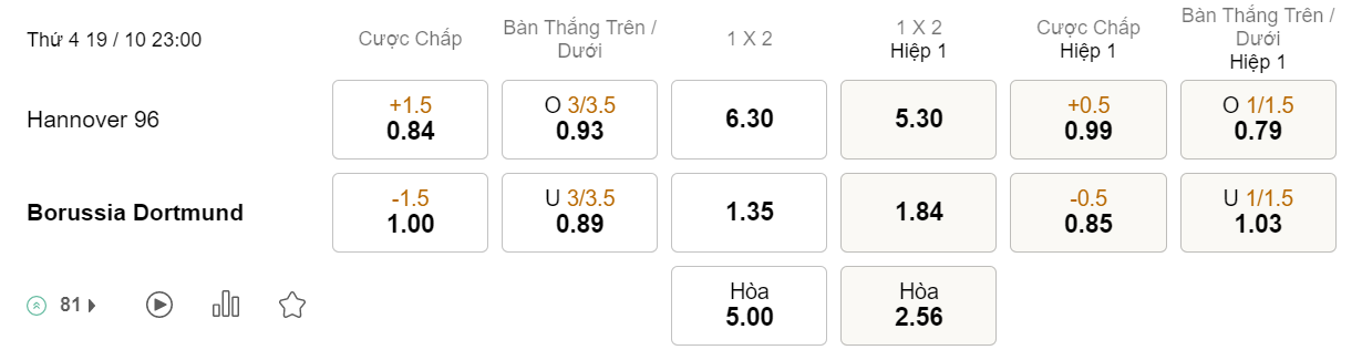 Soi kèo châu Á Hannover vs Dortmund: 0.84*1.5*1.00