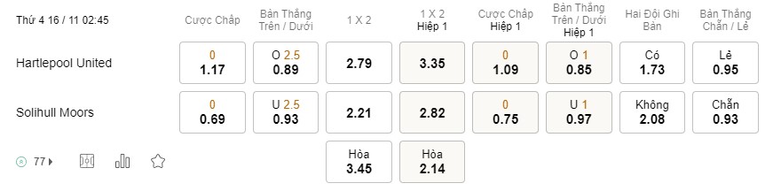 Tỉ lệ kèo Hartlepool vs Solihull Moors