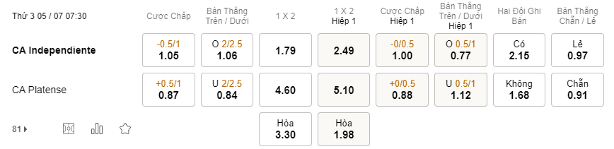 Có tới 2/3 trận sân nhà gần nhất của Independiente, bàn thắng chỉ xuất hiện ở nửa sau trận đấu. Trước một Platense đang phòng ngự kín kẽ, khả năng cao hiệp đấu đầu tiên cuộc đọ sức này sẽ khép lại với một kết quả hòa không bàn thắng.