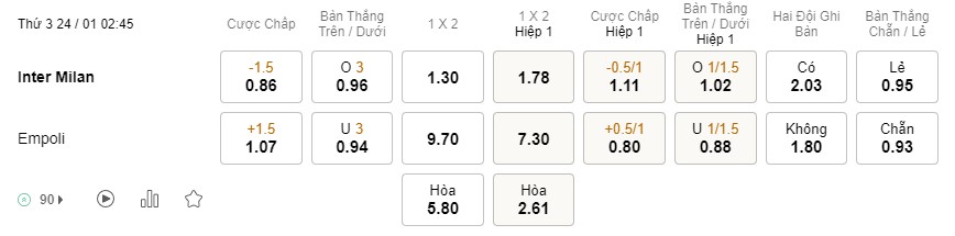 Tỉ lệ kèo Inter vs Empoli