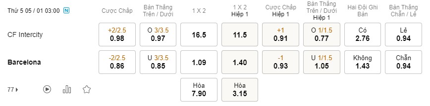 Tỉ lệ kèo Intercity vs Barcelona